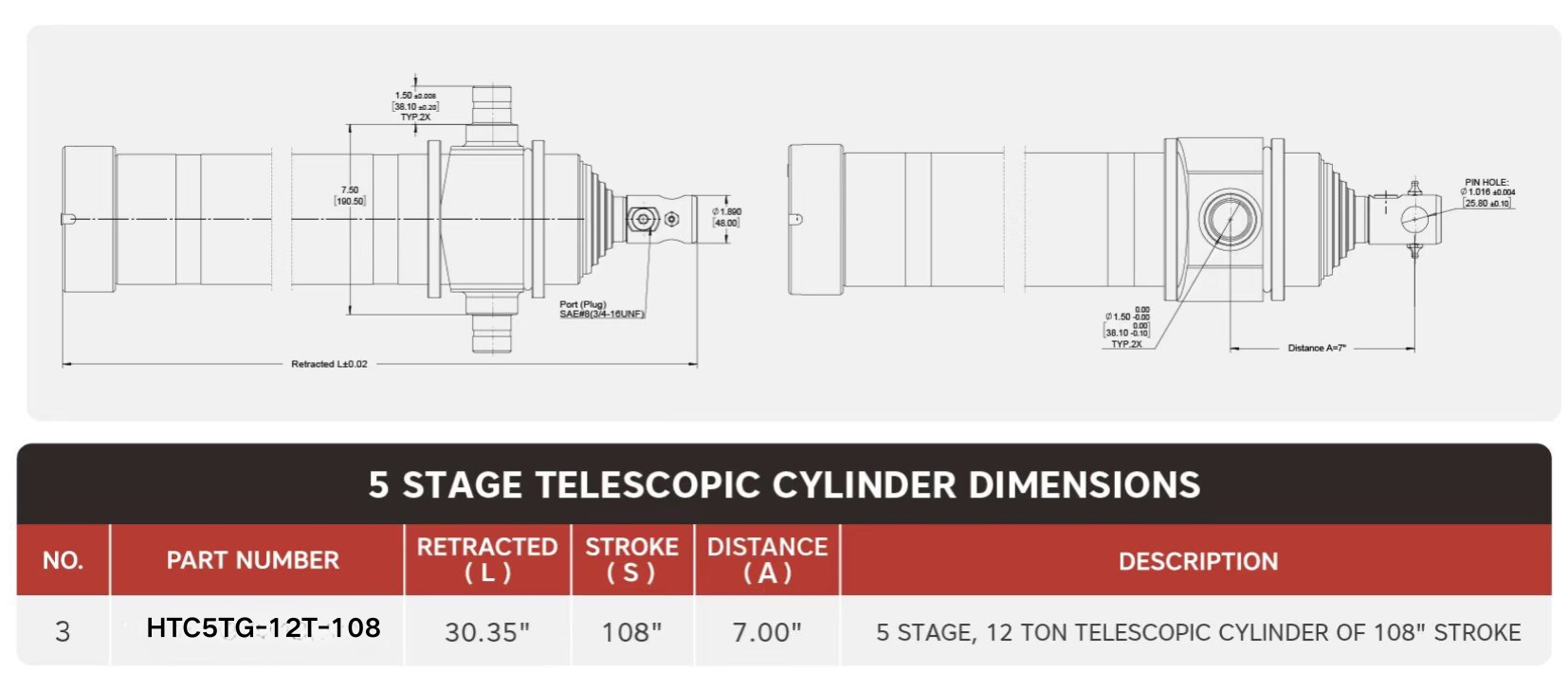 "HTC5TG-12T-108", 5 Tahap, 12 Ton 108" Stroke Teleskopik Silinder