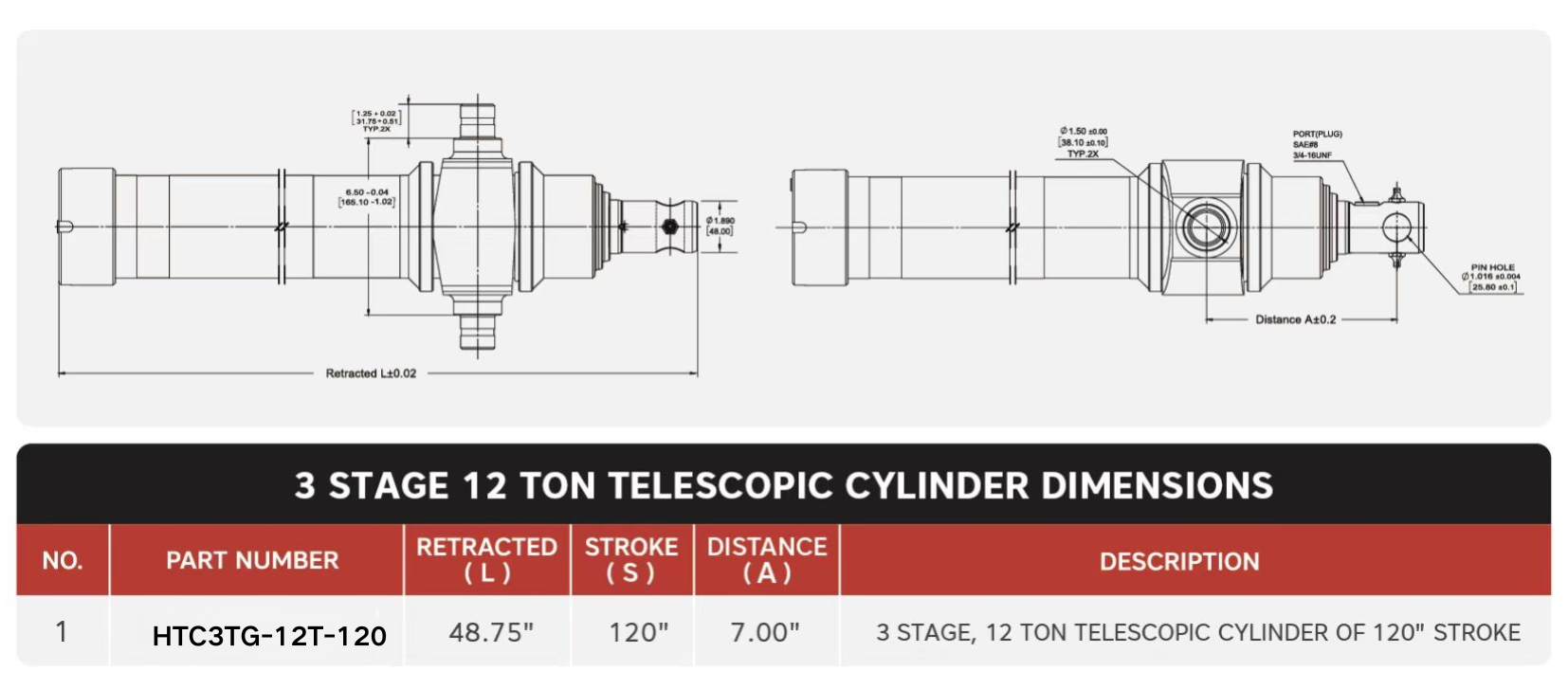 "HTC3TG-12T-120", 3 Tahap, 12 Ton 120" Stroke Teleskopik Silinder