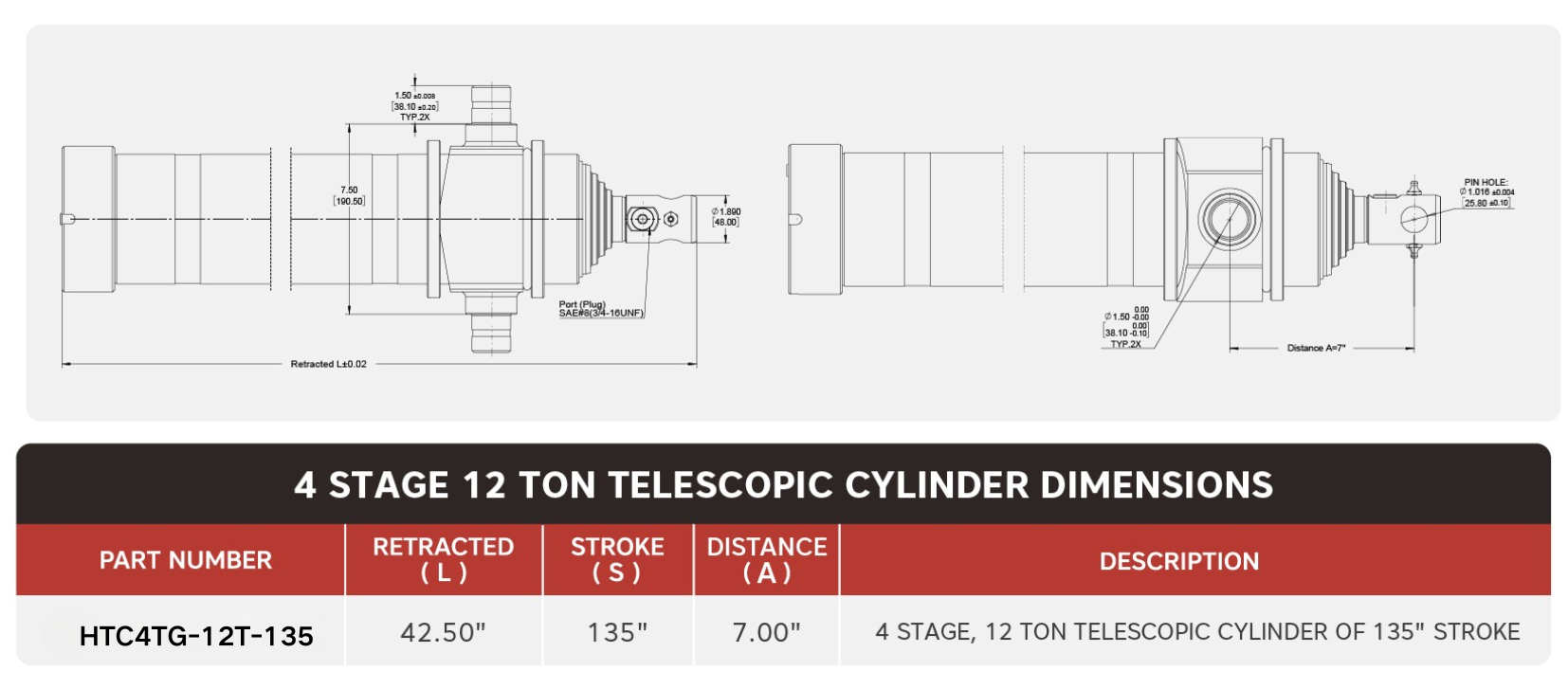 "HTC4TG-12T-135", 4 Tahap, 12 Ton 135" Stroke Telescopic Cylinder