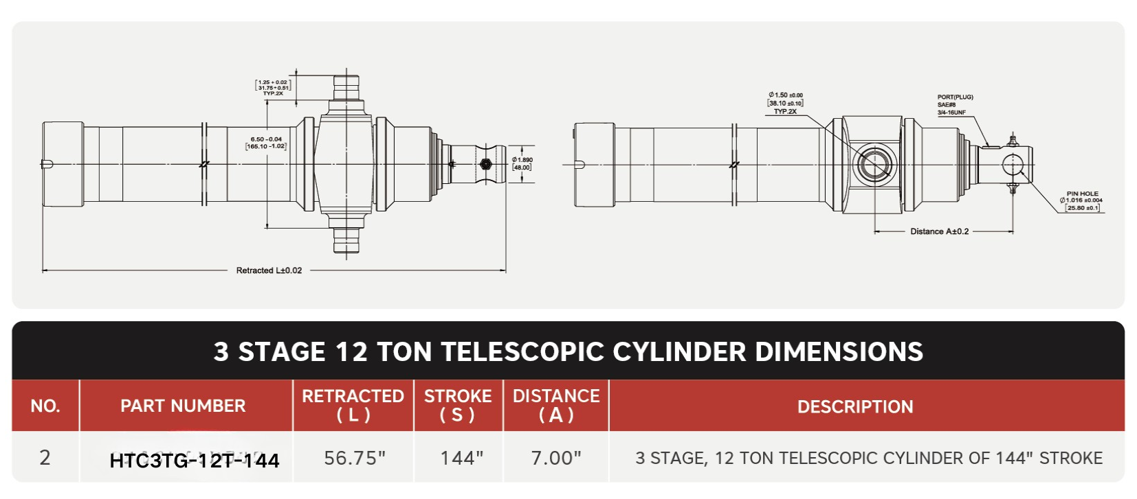 "HTC3TG-12T-144", 3 Tahap, 12 Ton 144" Stroke Teleskopik Silinder