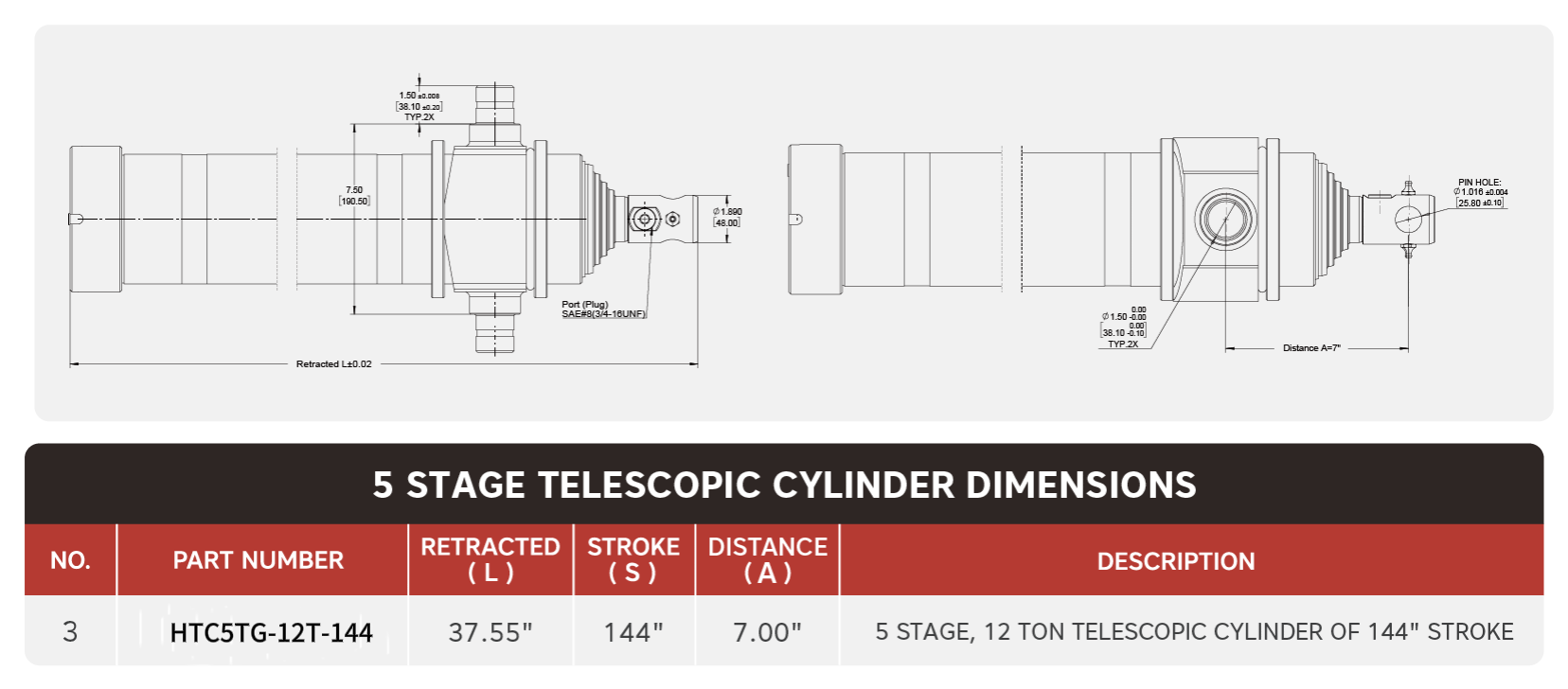 "HTC5TG-12T-144", 5 Tahap, 12 Ton 144" Stroke Teleskopik Silinder