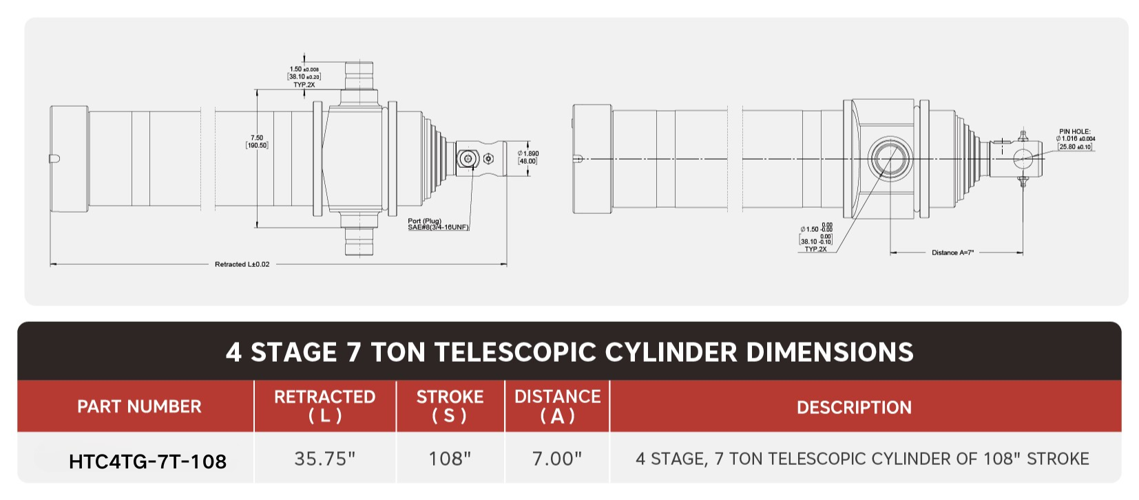 "HTC4TG-7T-108", 4 Tahap, 7 Ton 108" Stroke Telescopic Cylinder