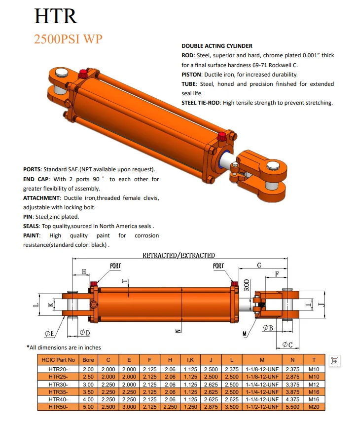 HCIC Standard Clevis Welded Cylinder iki nduweni bolongan 4 ", stroke 36", lan rod diameter 2". Lakon kaping pindho SAE 8 (-08) ORB(F) port kerja Tekanan kerja maksimum 2.500 PSI Clevis munggah 1" dipasang pin klebu Cat ireng gloss awet lan tahan luntur