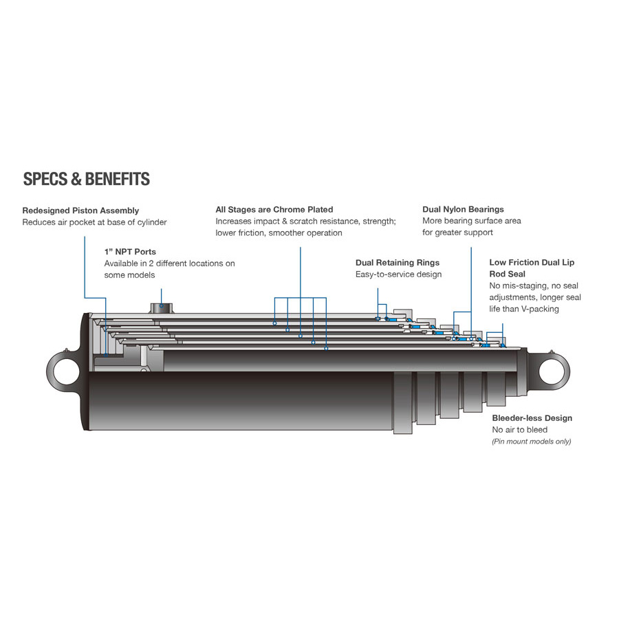 Silinder teleskopik pin HCIC asli dirancang kanggo operasi sing bisa dipercaya. Kanthi dandan desain utama liwat silinder saingan liyane kaya bleeder kurang desain, gesekan kurang dual lip rod segel lan kabeh orane tumrap sekolah dilapisi krom lan roller burnished kanggo operasi Gamelan, tambah goresan lan impact resistance, teyeng / karat lan fretting resistance lan stabilitas luwih. . Segel batang bibir ganda sing kurang gesekan khusus uga duwe akeh mupangat kalebu nyuda gesekan sing mlaku kanggo operasi sing luwih lancar lan luwih cepet, ora ana tahapan sing kantun, ora ana pangaturan segel sing dibutuhake, ora ana set kompresi kaya standar V-packing, umur segel luwih dawa tinimbang V-packing lan a kisaran suhu operasi sing luwih apik.
